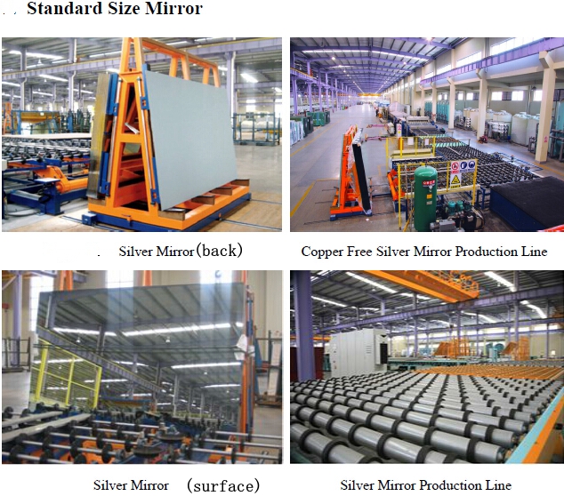 Silver Mirror is produced by coating a silver film, a copper film and two layers of waterproof paint on the back of quality clear float glass. The silver mirror could also be called silver coated mirror, silver coated mirror glass, clear mirror glass, mirroed glass, looking glass, etc.