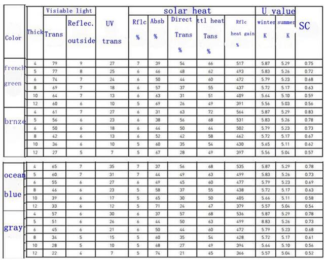 Tinted Float glass is made of molten glass mixing with a prescribed quantity of tint agent, which flows through tweel to tin bath and then to lehr. While floating through the molten tin, the glass under the works of gravity and surface tension becomes smooth and flat at both sides. Tints available are French green, Ocean blue, Bronze,Grey